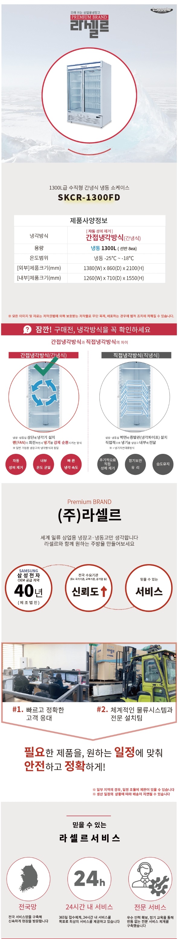 • [라셀르] 간냉식 냉동 쇼케이스 1300L 2도어 선반8EA 자동성에제거 SKCR-1300FD