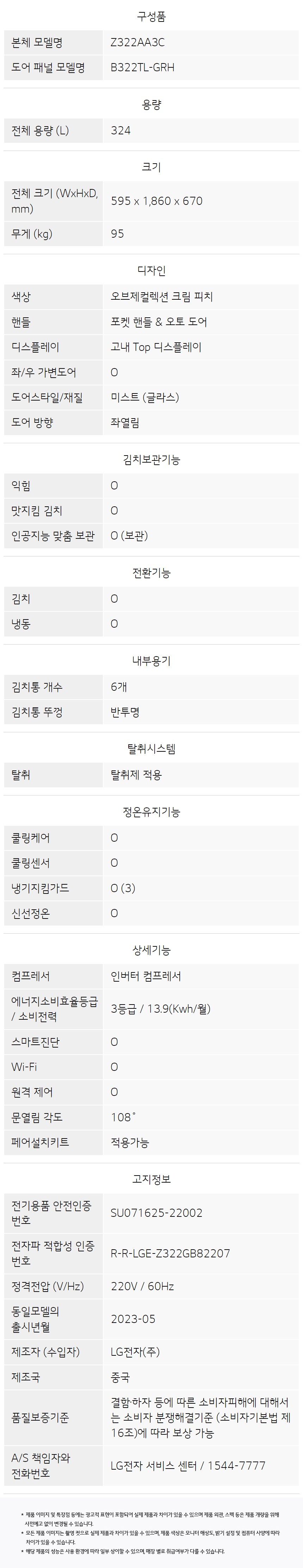 • [LG] 컨버터블오브제컬렉션1도어김치냉장고(좌열림)324L크림피치 Z322GH3CS